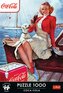 Puzzle Coca-Cola: Czas na przerwę przedstawiają uśmiechniętą dziewczynę z butelką słynnego napoju na tle jeziora. Po ich ułożeniu powstanie obraz o wymiarach 683x480 mm.