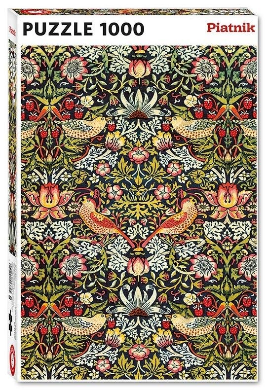 Wielkość obrazu po ułożeniu: 67,5 x 44,1 cm. Układanie puzzli to twórcza rozrywka bez względu na wiek. Rozwija spostrzegawczość, uczy wytrwałości i ćwiczy koncentrację. Jest wyzwaniem, z którym można zmagać się w pojedynkę lub w większym gronie. Motywem głównym tych puzzli jest charakterystyczna mozaika, stworzona przez angielskiego malarza Williama Morrisa - "Złodziej Truskawek".