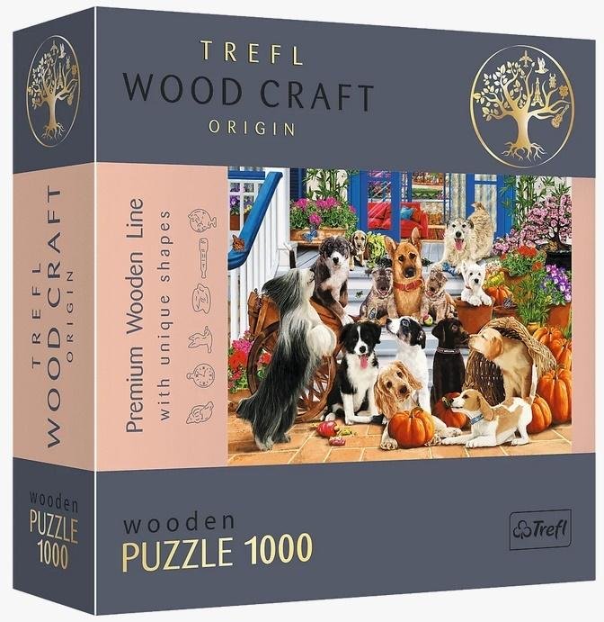 Seria puzzli 1000 elementów jest idealna dla wszystkich miłośników układanek, pozwoli stworzyć obrazek o wymiarach 51,9 x 37,5 cm przedstawiający grupę psów odpoczywających przed domem. Układanka została wykonana z drewna, a opakowanie przyjazne środowisku w całości z tektury. Puzzle zawierają nieregularne elementy oraz 100 figurek w kształcie zwierząt.