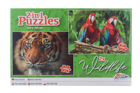 Balení obsahuje 2 puzzle každé o 1000 dílcích - tygra a papoušky.Rozměr puzzle cca 50 x 70 cm.Rozměr balení 35 x 22 x 6 cm. przeczytaj całość