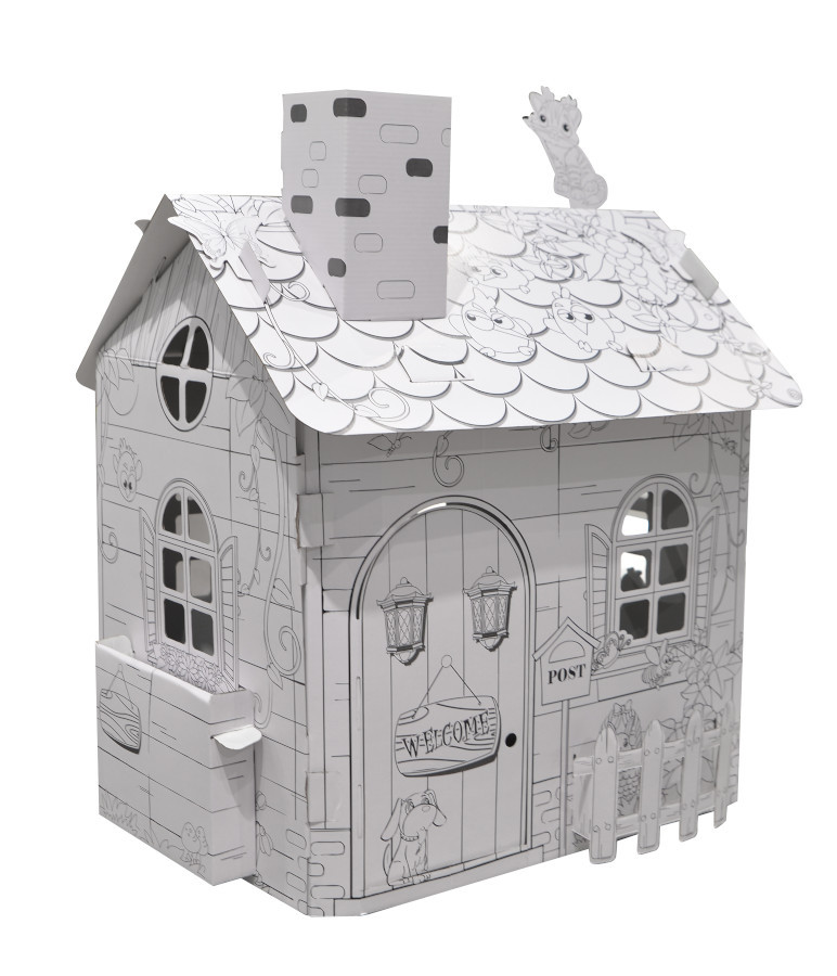 Kartonový domeček s dětskými motivy je celý černobílý a jeho stěny slouží k vymalování. Barevné provedení je zcela na fantazii dítěte. Domeček má otevírací okna i dveře a následně může sloužit jako skrýš pro hračky. Součástí balení je 6 ks popisovačů. Rozměr 54 cm x 45 cm x 64,5 cm. przeczytaj całość