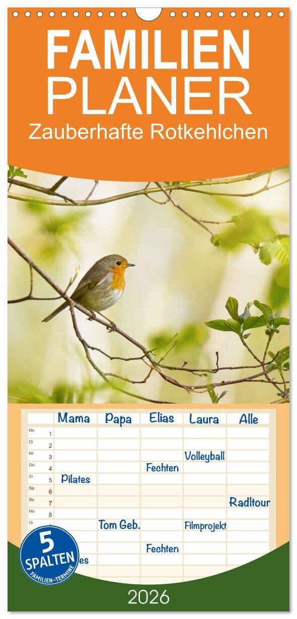 Familienplaner 2026 - Zauberhafte Rotkehlchen mit 5 Spalten (Wandkalender, 21 x 45 cm) CALVENDO (niemiecki)