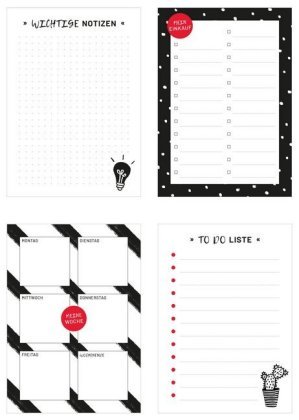 4 Blöcke im Set in schwarz-weiß, inkl. Einkaufsliste, Notizblock, ToDo-Liste und Wochenplaner. (niemiecki)