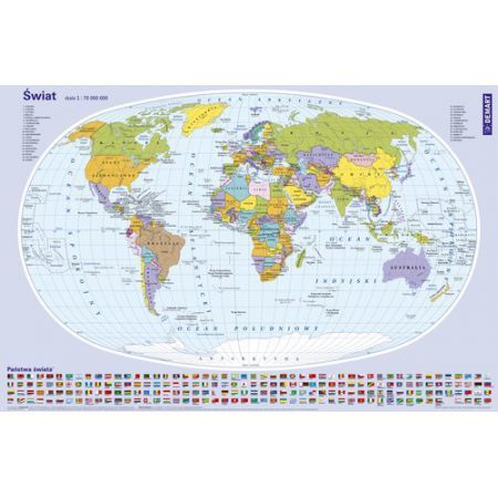 Mapa świata z podziałem politycznym jest wykonana w skali 1 : 70 000 000. Pod flagami wszystkich państw są informacje o ich powierzchni i liczbie ludności. To świetna pomoc w opanowaniu nazw państw i ich stolic, z wyszczególnieniem na jakim są położone kontynencie, zapamiętaniu relacji...