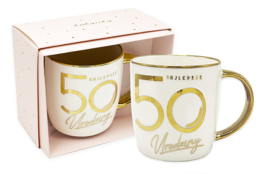 Kubek Elite "Urodziny 50" EL-005 Kubki Elite Kukartka to doskonały pomysł na prezent. Wykonane z wysokiej jakości porcelany, kubki są eleganckie, subtelnie ozdobione złotem i zapakowane w piękne pudełko. Cechy szczególne: Typ produktu: kubek na prezent, Materiał: porcelana, Wymiary: wys. kubka: 9...