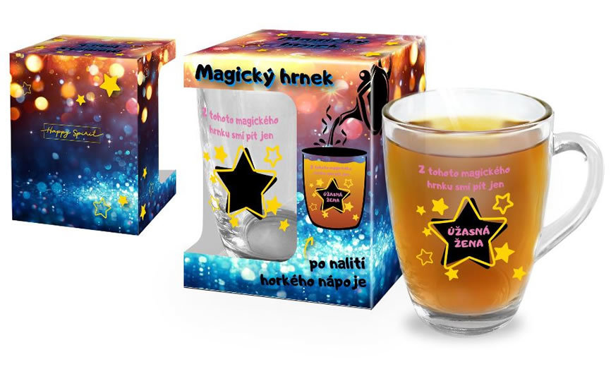 Stylový skleněný hrnek s magickým efektem po nalití horkého nápoje změní design a odhalí tajemství ukrytého nápisu svému majiteli. Baleno v dárkové krabičce. Objem 330 ml, nevhodné do myčky. przeczytaj całość