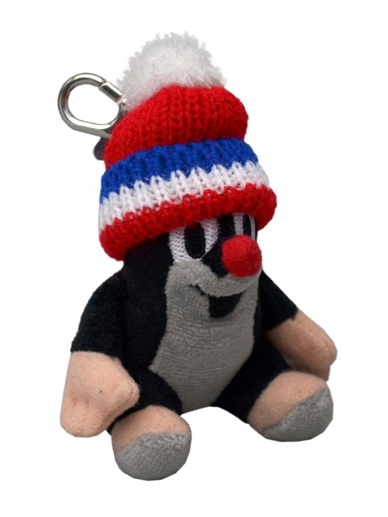 Krtek 9cm sedící s kulichem v červené trikoloře s karabinkou