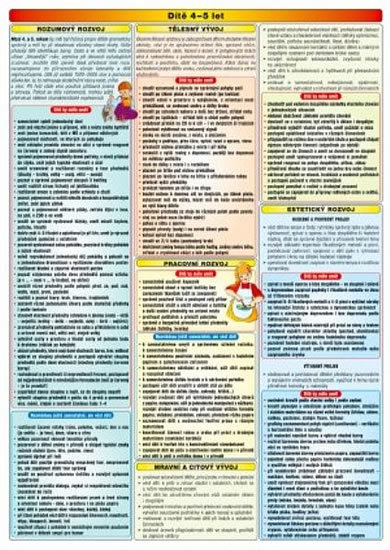 Co i kiedy dziecko ma znać i umieć, co robić, a czego nie robić. W obrazowych i przejrzystych tabelach przedstawiono rozwój dziecka w układzie czasowym pod względem fizycznym, umysłowym, uczuciowym i moralnym, praktycznym oraz estetycznym. Tabele przedstawiają rozwój dziecka od 3 do 6 lat, szczególnie odnosząc się do przygotowania do rozpoczęcia nauki w szkole podstawowej. Laminowany dwuczęściowy arkusz formatu A4.