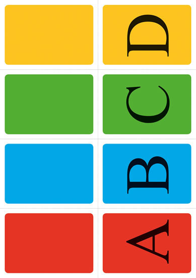 Karty wspierające ocenianie kształtujące. Zestaw po rozcięciu zawiera 14 dwustronnych kolorowych kart: warianty z literami A, B, C, D, cztery karty w podstawowych kolorach (czerwona, niebieska, zielona, pomarańczowa), odpowiedzi TAK, NIE, NIE WIEM oraz trzy karty z emotikonami (uśmiechnięta, smutna i neutralna twarz). Każda z tych kart do głosowania ma jednobarwne tło, a na odwrocie znajduje się logo zestawu materiałów edukacyjnych AMOS. Karty są odpowiednim uzupełnieniem pracy z MIUč+, do prostego odpowiadania na zadawane pytania, samooceny uczniów lub jako pomoc przy podstawowym wyrażaniu uczuć. NNS1A-00