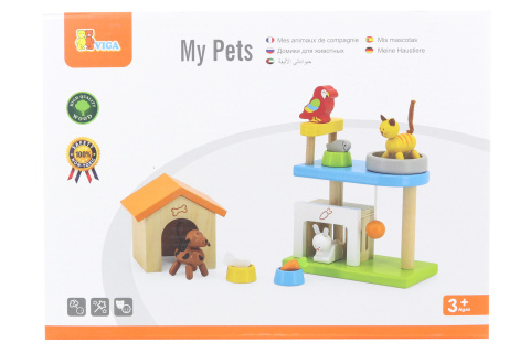 Dřevěná domácí zvířátka. Balení obsahuje pejska, kočku, papouška, králíka a další doplňky o rozměrech cca 11,5 x 15,5 x 6 cm. Rozměr balení cca 24 x 18 x 7 cm. Věk 3+ przeczytaj całość