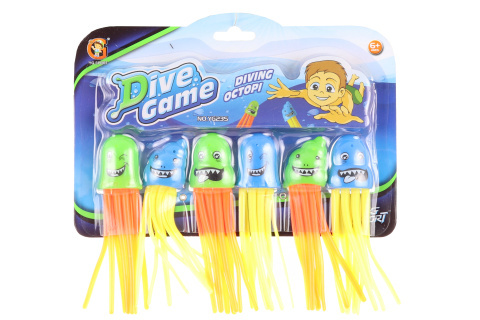 Ośmiorniczki do nurkowania. Opakowanie zawiera 6 różnych ośmiorniczek. Nadają się do urozmaicenia szkolenia pływackiego i nurkowego lub do użycia w domowym basenie (pod nadzorem osoby dorosłej). Wymiary opakowania ok. 23,5 x 21,5 x 2,5 cm. Wiek 6+ przeczytaj całość