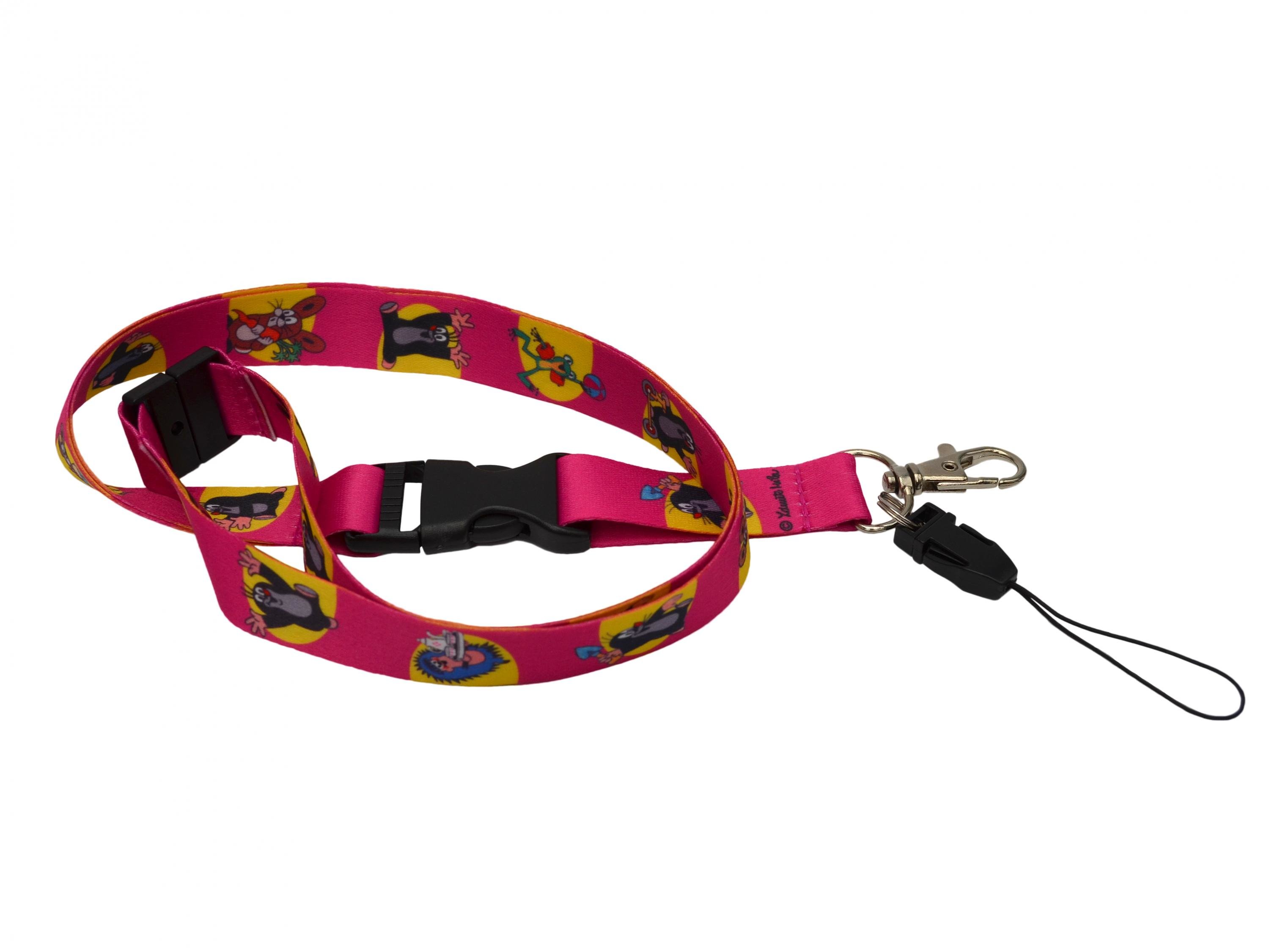 Saténová šňůrka na krk s motivem Krtečka a jeho kamarádů, opatřená bezpečnostní sponou proti uškrcení. Spodní část s kovovou karabinkou a smyčkou na mobil lze oddělit a použít samostatně. Délka 50 cm. Šířka popruhu 20 mm. przeczytaj całość