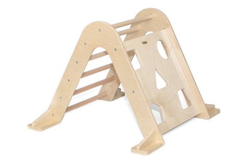 Dřevěný přelézací trojúhelník. Z jedné strany jsou žebřiny, z druhé vkládačka. Rozměry 74x80,6x58 cm. Rozměry balení 76x60x8 cm. Věk 18m+ przeczytaj całość