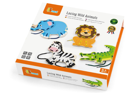 Ta nawlekanka zawiera cztery różne drewniane zwierzątka oraz cztery kolorowe sznurki, które dzieci mogą łatwo przewlekać i tworzyć różne kombinacje. Zabawka jest dostarczana w praktycznym pudełku, które służy jednocześnie jako pojemnik do przechowywania, dzięki czemu wszystko jest zawsze przejrzyście uporządkowane. Przy wymiarach ok. 21 x 19 x 4,5 cm nawlekanka jest łatwa do przenoszenia, więc może towarzyszyć dziecku w podróży i w domu.