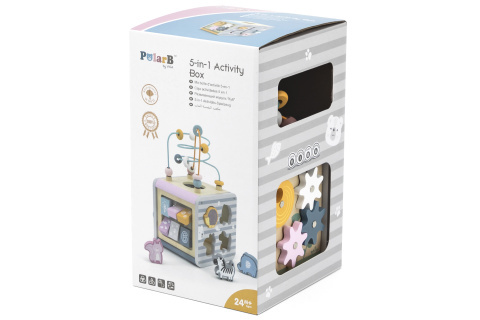 Drewniane pudełko z aktywnościami 5 w 1. Zawiera układankę (wkladankę), labirynt, labirynt do przechodzenia, zębate kółka oraz elementy obrotowe. Wymiary ok. 18 x 18 x 31,5 cm. Wymiary opakowania ok. 20,5 x 32,5 x 19 cm. Wiek 24m+ przeczytaj całość