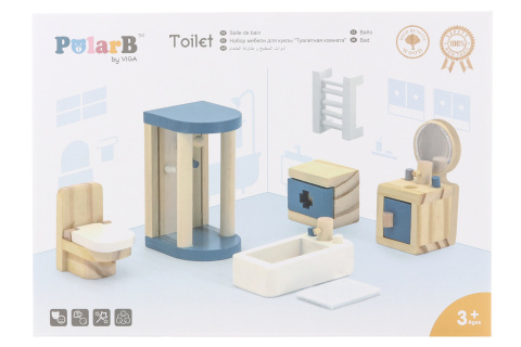 Drewniana łazienka dla lalek. Opakowanie zawiera wannę, kabinę prysznicową, toaletę, umywalkę, grzejnik i inne akcesoria. Wymiary opakowania ok. 30 x 21,5 x 5,5 cm. Wiek 3+ przeczytaj całość