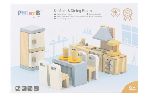 Drewniana kuchnia i jadalnia dla lalek. Opakowanie zawiera lodówkę, zabudowę kuchenną, stół, krzesła i inne akcesoria. Wymiary opakowania ok. 30 x 21,5 x 5,5 cm. Wiek 3+ przeczytaj całość