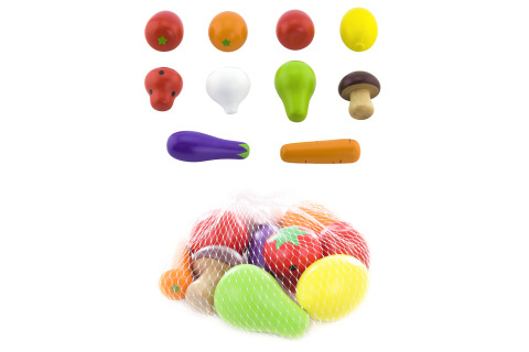 Drewniane owoce i warzywa w siatce. W opakowaniu znajduje się drewniana marchewka, pomidor, czosnek, bakłażan, grzybek, pomarańcza, truskawka, jabłko, cytryna i gruszka. Wymiary opakowania ok. 15 x 15 x 5 cm. Wiek 3+ przeczytaj całość