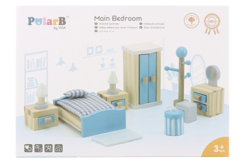 Drewniana sypialnia dla lalek. Opakowanie zawiera łóżko, 2 stoliki nocne, 2 lampki, szafę, wieszak, komodę, stołek i inne akcesoria. Wymiary opakowania ok. 30 x 21,5 x 5,5 cm. Wiek 3+ przeczytaj całość