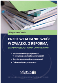 Publikacja opisuje zasady przekształcania szkół w związku z reformą oświaty oraz zadania dyrektorów dotyczące przekazywania i prowadzenia dokumentacji szkolnej. Usystematyzowane w tabeli konkretne terminy nie pozwolą przeoczyć żadnej wymaganej prawem czynności. Ponadto materiał zawiera odpowiedzi na najczęściej pojawiające się pytania i wzory dokumentów do wykorzystania.