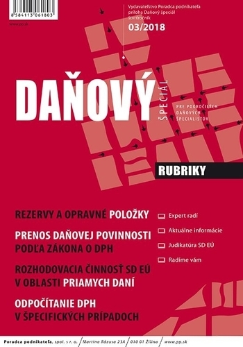 Tretie vydanie Daňového špeciálu vám priblíži témy ako: prenos daňovej povinnosti zákona o DPH, rezervy a opravné položky v ZDP, rozhodovacia činnosť Súdneho dvora Európskej únie, odpočítanie DPH v špecifických prípadoch a ďalšie zaujímavé témy. V prípade, že vás témy v publikácii zaujali, tak si ju zakúpte ihneď. Ponuka platí do vypredania zásob.