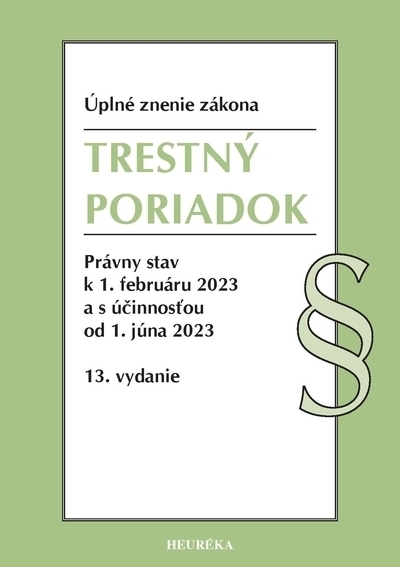 Publikácia obsahuje aktualizované úplné znenie Trestného poriadku č. 301/2005 Z.z. s právnym stavom k 1. februáru 2023 a s výraznenými zmenami poslednej novelizácie: zákona č. 150/2022 Z.z. o zmene a doplnení niektorých zákonov v súvislosti s novými sídlami a obvodmi súdov s účinnosťou od 1. júna 2023, zákona č. 340/2022 Z. z. a zákona č. 398/2022 Z.z.