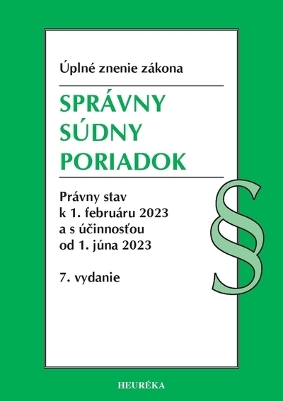 Publikácia obsahuje aktualizované úplné znenie zákona č. 162/2015 Z.z. Správneho súdneho poriadku s právnym stavom k 1. februáru 2023, a so zvýraznenými zmenami poslednej novelizácie: zákona č. 150/2022 Z.z. o zmene a doplnení niektorých zákonov v súvislosti s novými sídlami a obvodmi súdov s účinnosťou od 1. júna 2023, zákona č. 151/2022 Z.z., zákona č. 375/2022 Z.z. a zákona č. 398/2022 Z.z.