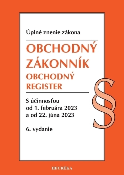 Publikácia obsahuje aktualizované úplné znenie Obchodného zákonníka č. 513/1991 Zb. so zmenami novelizácie: zákona č. 407/2022 Z. z. s účinnosťou od 22. júna 2023, a zákona č. 8/2023 Z. z. s účinnosťou od 1. februára 2023; a zákona č. 530/2003 Z. z. o obchodnom registri so zmenami novelizácie:...