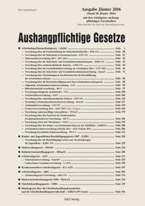 Diese Gesetzessammlung bietet eine Übersicht über die aushangpflichtigen (auflagepflichtigen) Vorschriften zum ArbeitnehmerInnenschutz in Österreich.§ArbeitnehmerInnenschutzgesetz - ASchG§Kinder- und Jugendlichen-Beschäftigungsgesetz 1987 - KJBG§Mutterschutzgesetz -...