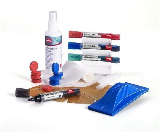 Popisovače se čtyřmi tekutými inkousty (černý, červený, modrý a zelený) Magnetický držák na popisovače 125ml čistič ve spreji s utěrkami pro suché stírání Magnetická stěrka tabule 5 doplňovacích sad pro stěrku 10 magnetů (25 mm) przeczytaj całość