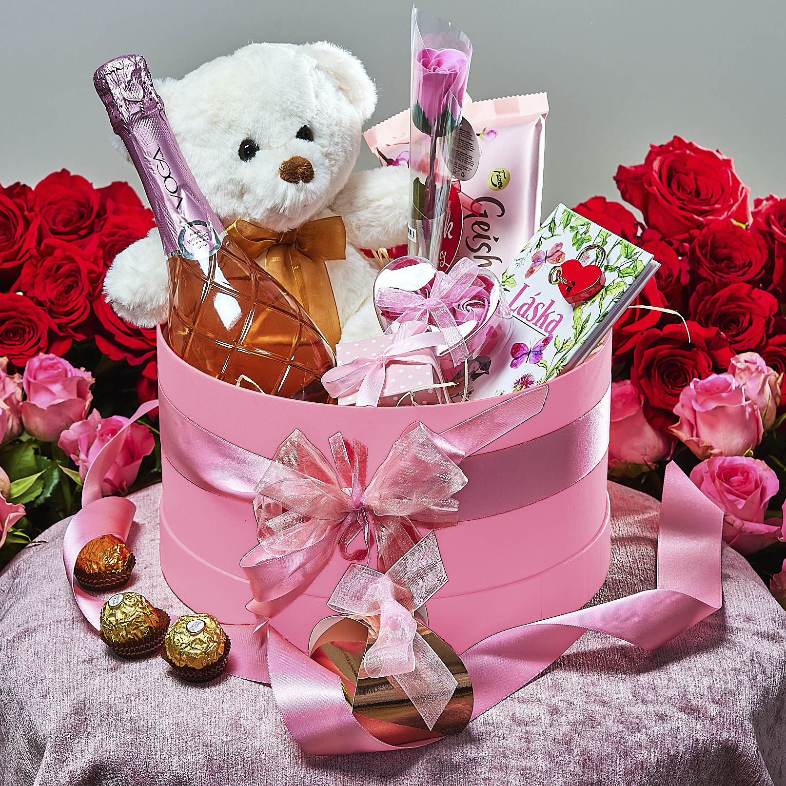 Růžová klobouková krabicePlyšový medvědLuxusní růžové Prosecco VOGA 0,75l2 skvělé čokolády GeishaLáska - kniha citátůKrásná mýdlová růžeKrabička mýdlových květůKrabička s puntíky a mašlíZámek láskyMetalická krabička s mašlíFerrerro Rocher pralinkyVše s nádhernou mašlí v celofánu przeczytaj całość