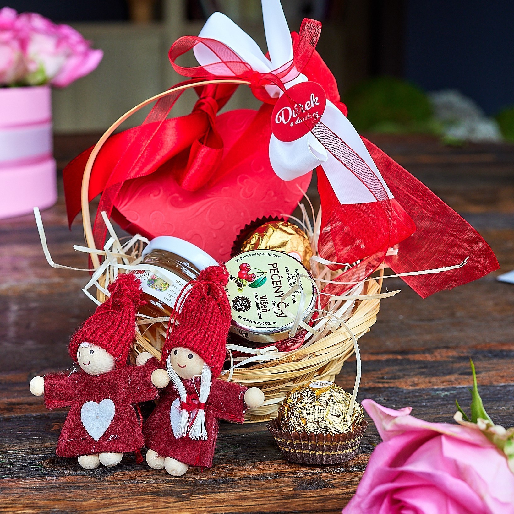 KošíčekPečený čajMedKrabička ve tvaru srdce s mašlíFerrerro Rocher pralinkyZamilovaní skřítciS nádhernou mašlí, v celofánu przeczytaj całość