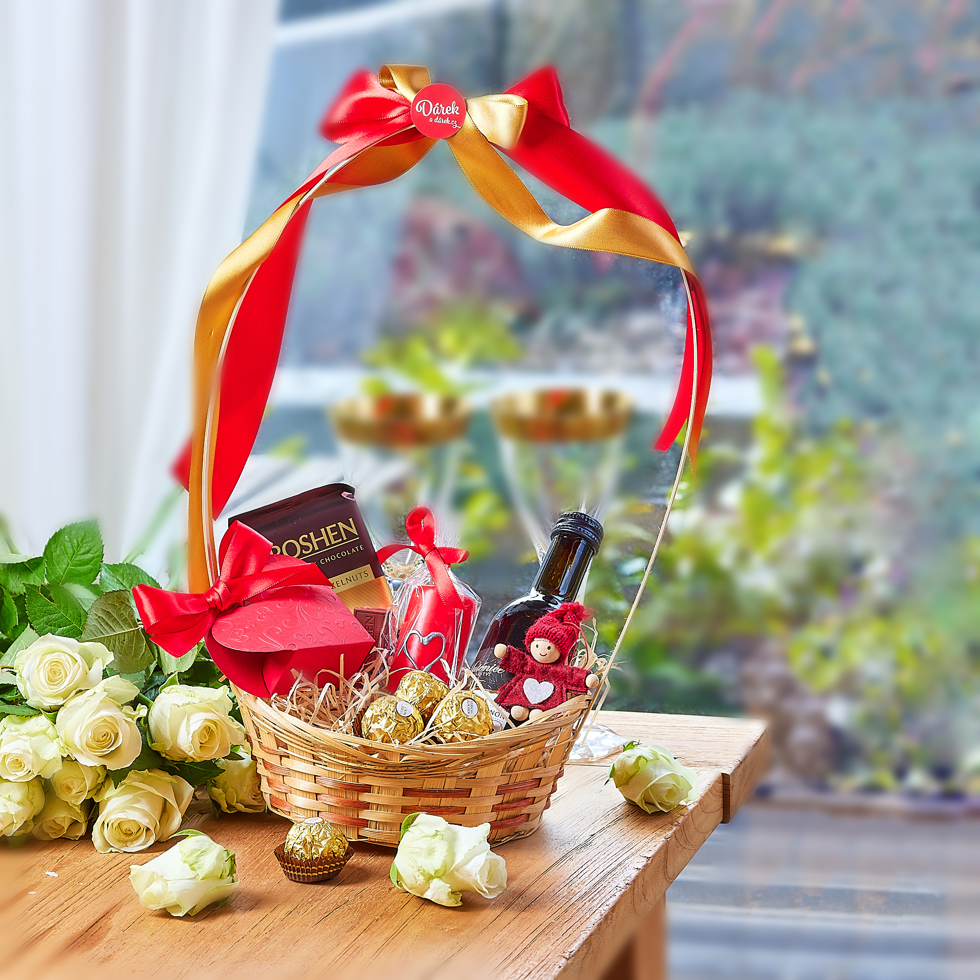 Košík s dlouhým odnímatelným uchemCebernet Savignon, Mutěnice, 0,2lLuxusní čokoláda s oříškyFerrerro Rocher pralinkySkřítek láskySvíčka se srdcemZápalkyVše s nádhernou mašlí v celofánu przeczytaj całość