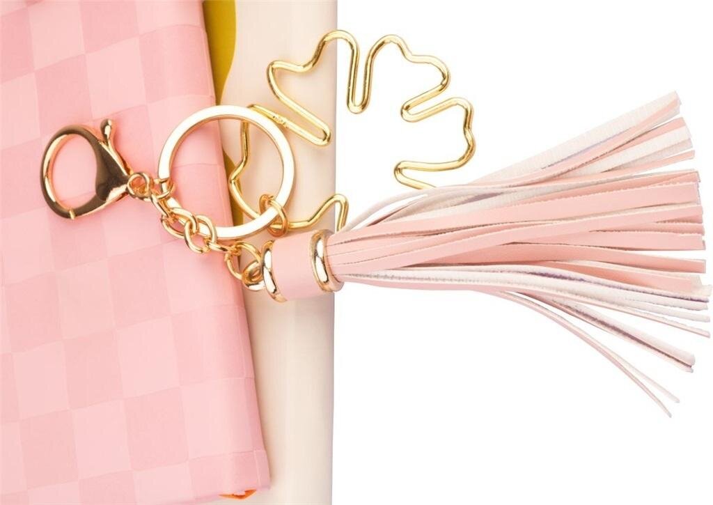 Śliczny metalowy brelok ze złotym kwiatkiem i różowym chwostemimitującym skóręStylowy dodatek do torebki, świetnie się nadaje jako prezentFormat: 17 x 5,8 cm przeczytaj całość