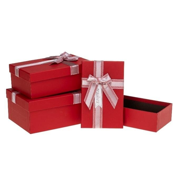 Zestaw pudełek prezentowych z kokardą 3szt czerwonyWymiary pudełek:S: 19x12x6,5cmM: 21x14x8cmL: 23x16x9,8cm przeczytaj całość