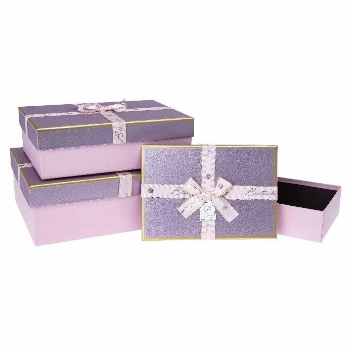 Zestaw pudełek prezentowych z kokardą 3szt fioletowyWymiary pudełek:S: 24,5x17x6,5cmM: 29x21x9cmL: 33,5x25x11,5cm przeczytaj całość