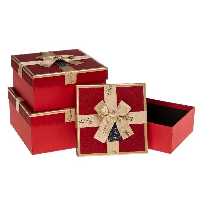 Zestaw pudełek prezentowych z kokardą 3szt czerwonyWymiary pudełek:S: 15x15x6.5cm M: 17x17x8cmL: 19x19x9,5cm przeczytaj całość