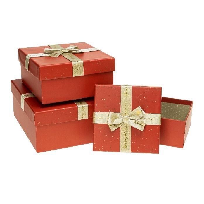 Zestaw pudełek prezentowych z kokardą 3szt czerwonyWymiary pudełek:S: 14x14x7cm M: 17x17x9cmL: 21x21x10cm przeczytaj całość