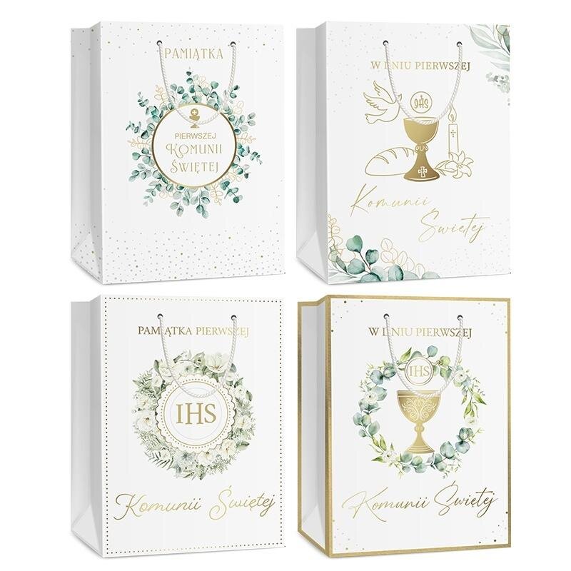 Torba prezentowa w formacie a4, bogato ozdobione srebrną lub złotą folią. Gruby papier o dużej sztywności gramatura 210 g/m torby pakowane po 12 sztuk (4 wzory po 3 sztuki) przeczytaj całość