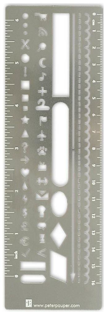 Metalowa zakładka marki Peter Pauper Press. Uniwersalne narzędzie, które jest szablonem, linijką i zakładką w jednym! Idealna do tworzenia notatek, bullet journalingu itp. Zakladka jest dostarczana w przezroczystym etui ochronnym. Wymiary 18,1 x 6,4 cm. przeczytaj całość