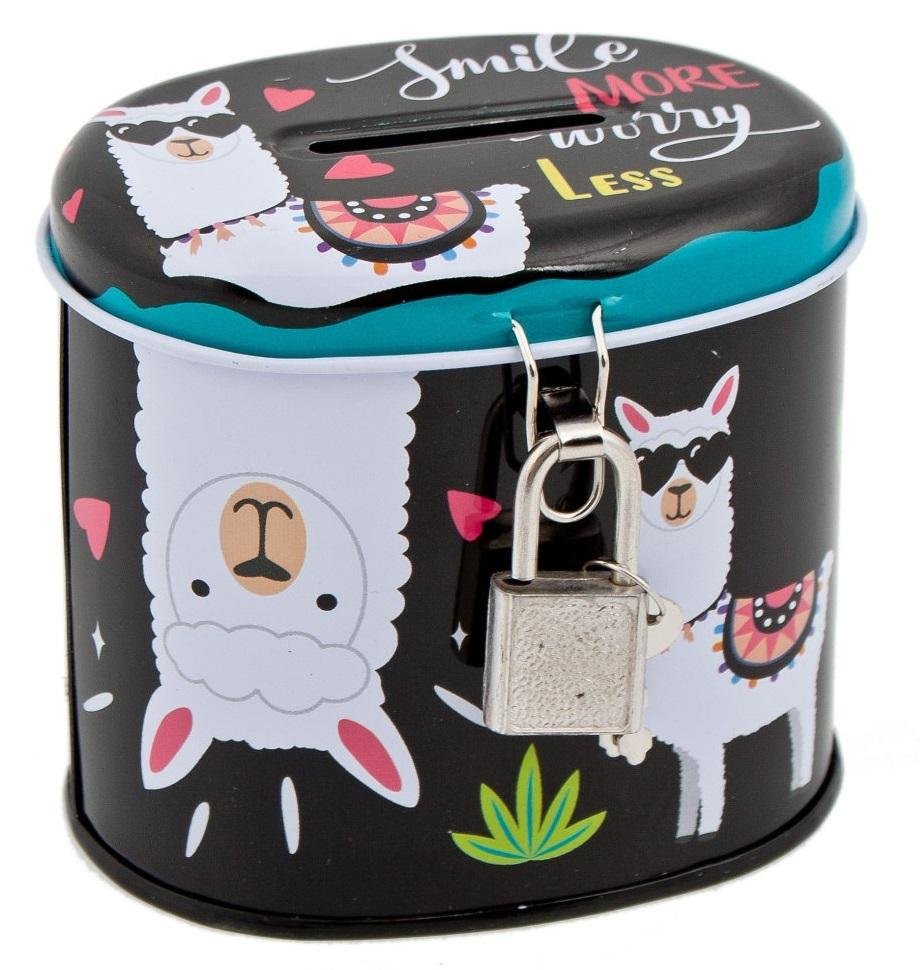 Metalowa skarbonka zamykana na kłódkę zdobiona w grafikę w Lamy. przeczytaj całość