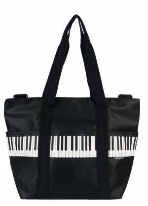 Piękna, pojemna torba na ramię z motywem klawiatury fortepianu po obu stronach, o rozmiarach 45x34x20 cm. Czarna z 3 uchwytami (dwa mniejsze i jeden dłuższy), zamykana na zamek. W środku znajdują się 3 kieszonki, a po zewnętrznych stronach aż 6. przeczytaj całość