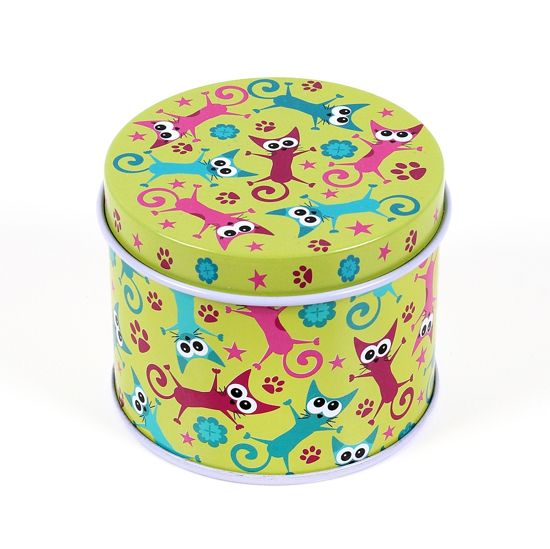 Kulaté plechovky s veselými motivy.Motiv : Ztřeštěné kočky przeczytaj całość