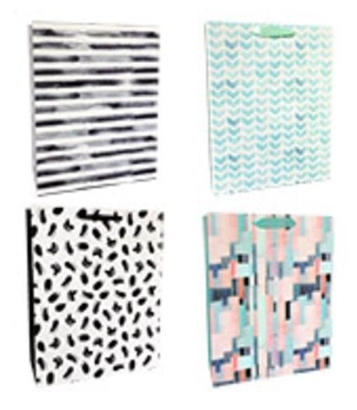 Miks wzorów, towar wysyłany losowo. Cena za sztukę.Wzory: pasy, pastelowe piksele.Torba prezentowa świąteczna, wymiary: 26 x 32 cm, matowa. przeczytaj całość