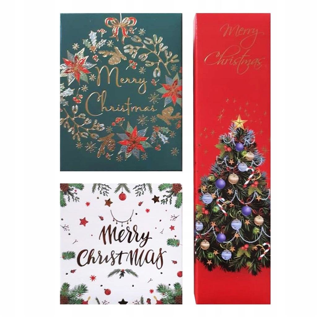 Zestaw pudełek prezentowych - 3 sztuki:wykonane z wysokiej jakości papieru,pokrywy ozdobione pięknym nadrukiem,elegancka świąteczna stylistyka,odpowiednie dla wszelkich prezentów świątecznych,zestaw 3 sztuki w różnych rozmiarach,odpowiedniej do wszelkich drobnych prezentów.Wymiary:pudełko L: 5,5...