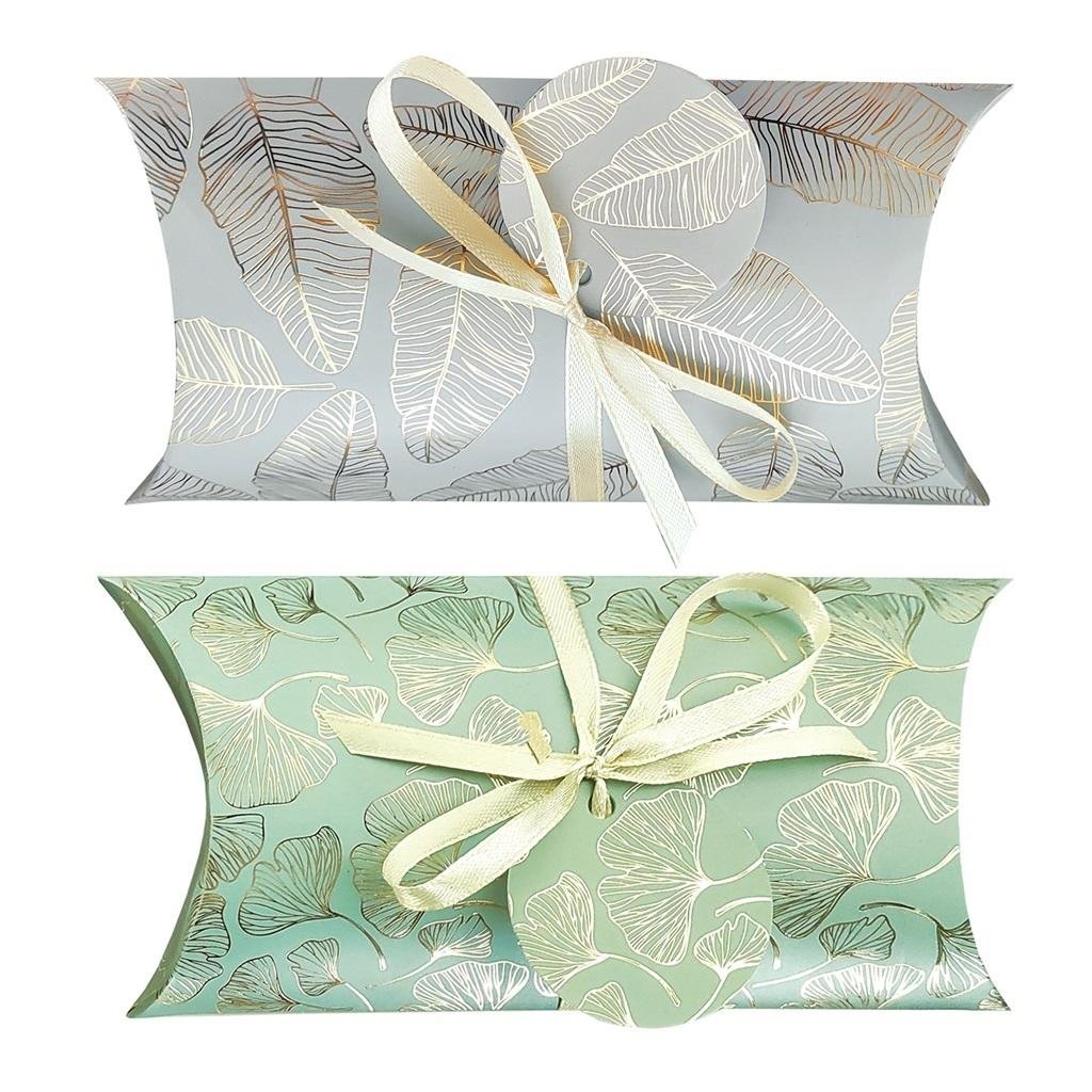 Zestaw 2 szt. pudełek w rozmiarze 22x10 cm cm na prezenty w kolorach taupe i zielonym ozdobionych gustownymi złotymi listkami. Podpisanie pudełka możliwe jest dzięki dołączonemu do niego tagowi oraz eleganckiej tasiemce. przeczytaj całość
