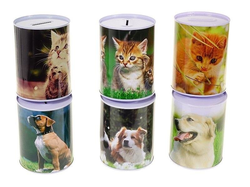Miks kolorów, towar wysyłany losowo. Cena za sztukę.Skarbonka metalowa - puszka z motywem psów i kotów. przeczytaj całość