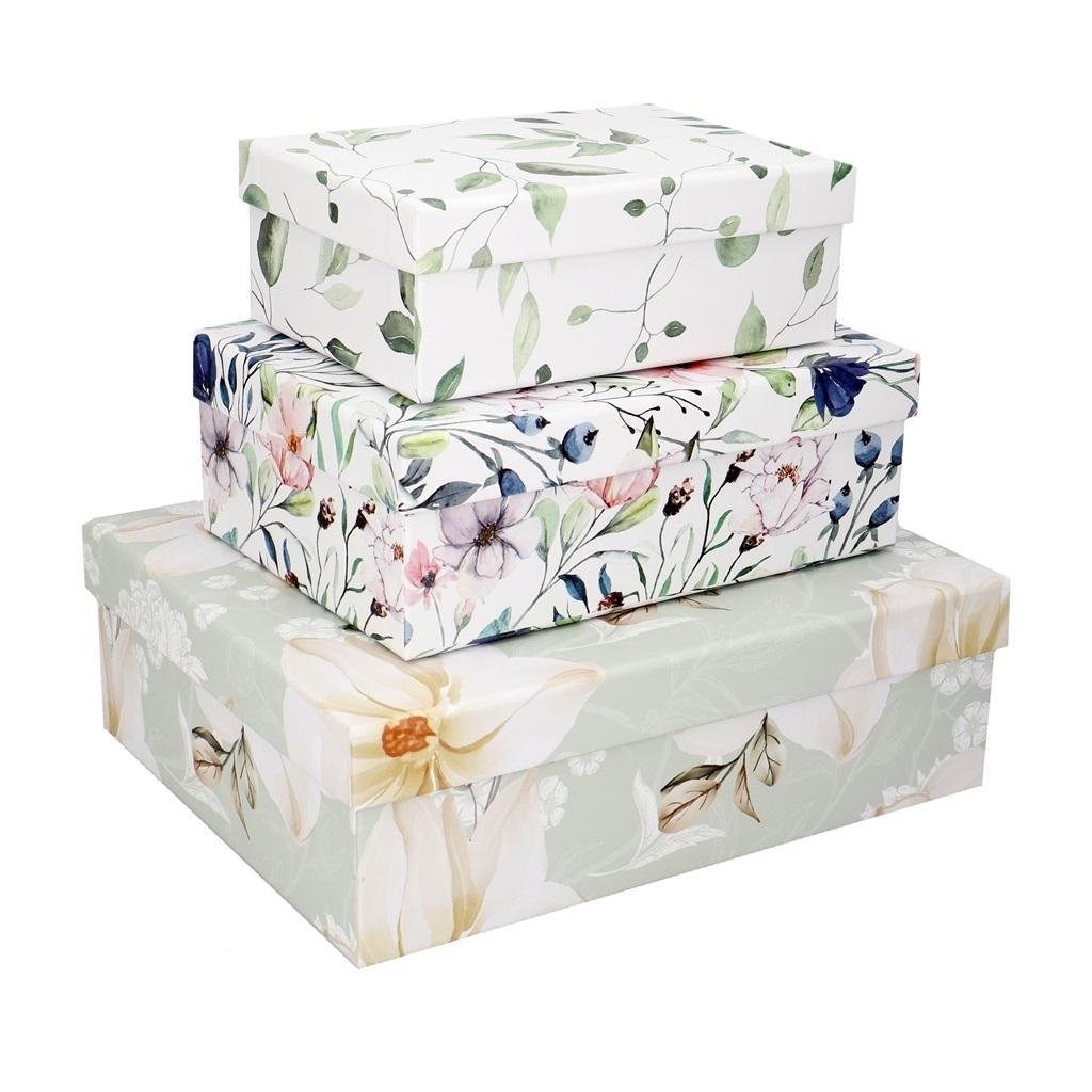 Zestaw 3 papierowych pudełek prezentowych w różnych rozmiarach: 16,5x11,5x6 cm, 20x14x7 cm, 25x20x8 cm z gustowną kwiatową grafiką. przeczytaj całość