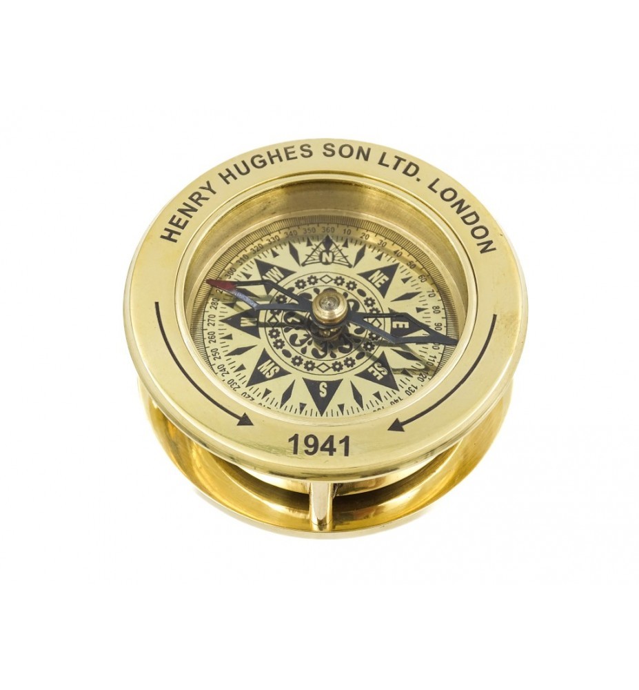 Pouzdro kompasu je vyrobeno z mosazi. Zlatý ciferník kompasu s černou větrnou...