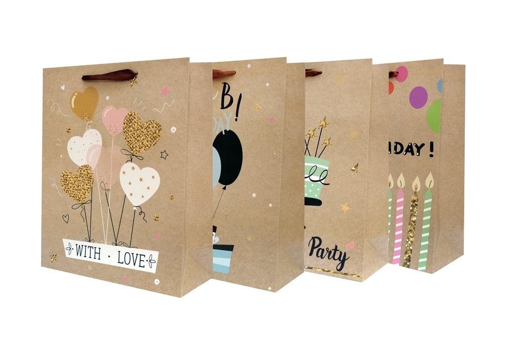 Mix 4 wzorów. Towar wysyłamy losowo.Torebka ozdobna, pionowa, o wymiarach 18x23x8 cm. Dostępna w estetycznyc 4 wzorach. Wykonana z papieru kraft. Zamiast sznurka znajduje się ozdobna wstążeczka. Posiada wzmacniany spód. przeczytaj całość